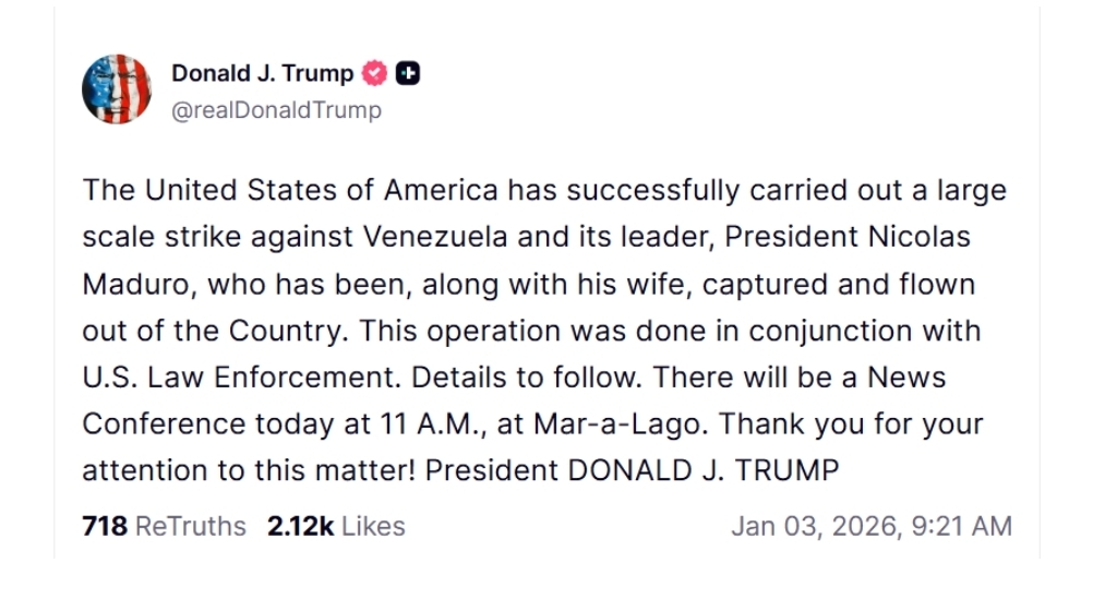 “Shtetet e Bashkuara të Amerikës kanë kryer me sukses një sulm në shkallë të gjerë kundër Venezuelës dhe udhëheqësit të saj, Presidentit Nicolas Maduro, i cili, së bashku me gruan e tij, është kapur dhe është larguar me aeroplan nga vendi”.